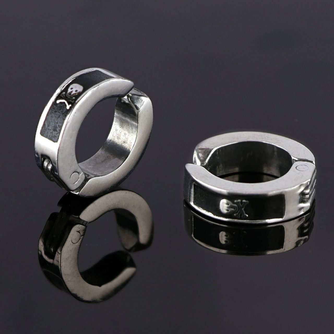 Ανδρικά σκουλαρίκια ατσάλινα από ανοξείδωτο ατσάλι σε ασημί χρώμα HOOPS (& UNISEX) για όλες τις ηλικίες και σχέδιο mini νεκροκεφαλή 4 mm πάχος και 14 mm εξωτερική διάμετρο - συσκευασία 2 τεμαχίων (ζευγάρι)