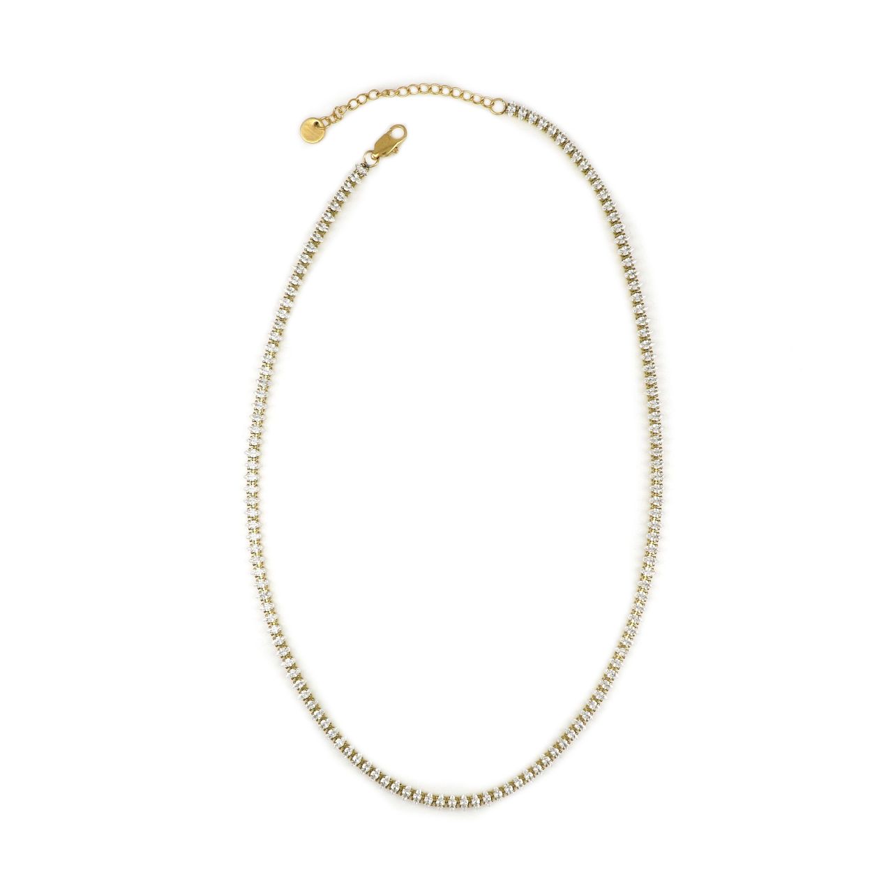 Κολιέ Ριβιέρα επίχρυσο από ανοξείδωτο ατσάλι με λευκά ζιργκόν. Το Μήκος του κολιέ είναι 40+5 εκ, προσφέροντας μια άνετη και κομψή εφαρμογή γύρω από τον λαιμό