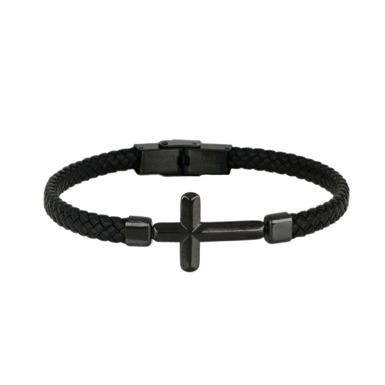 Men's black leather bracelet with black steel cross (BR22300-02)