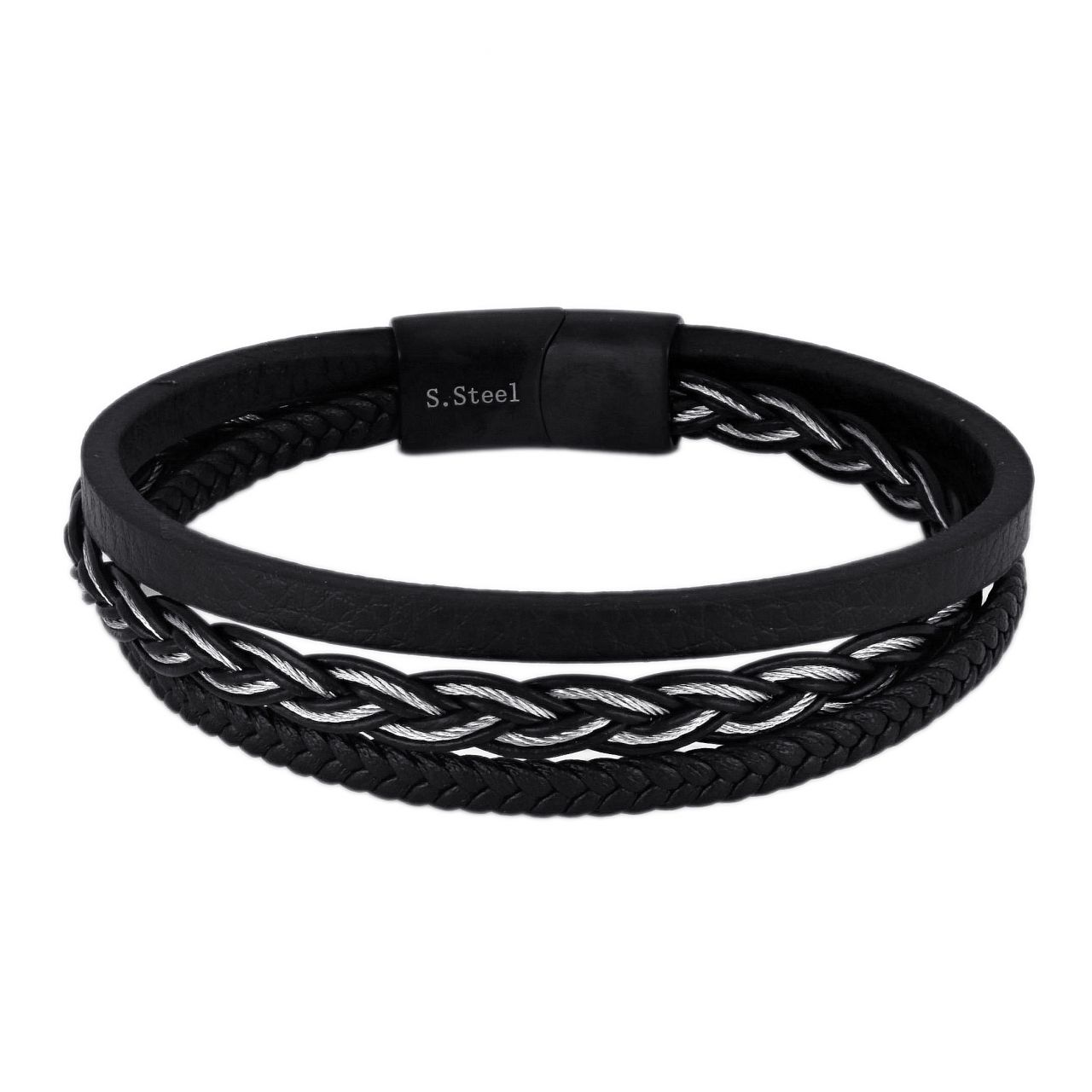 Men's bracelet with three rows of black leather and stainless steel wire. The width is 22cm. It has a steel clasp. This bracelet highlights your style and personality.