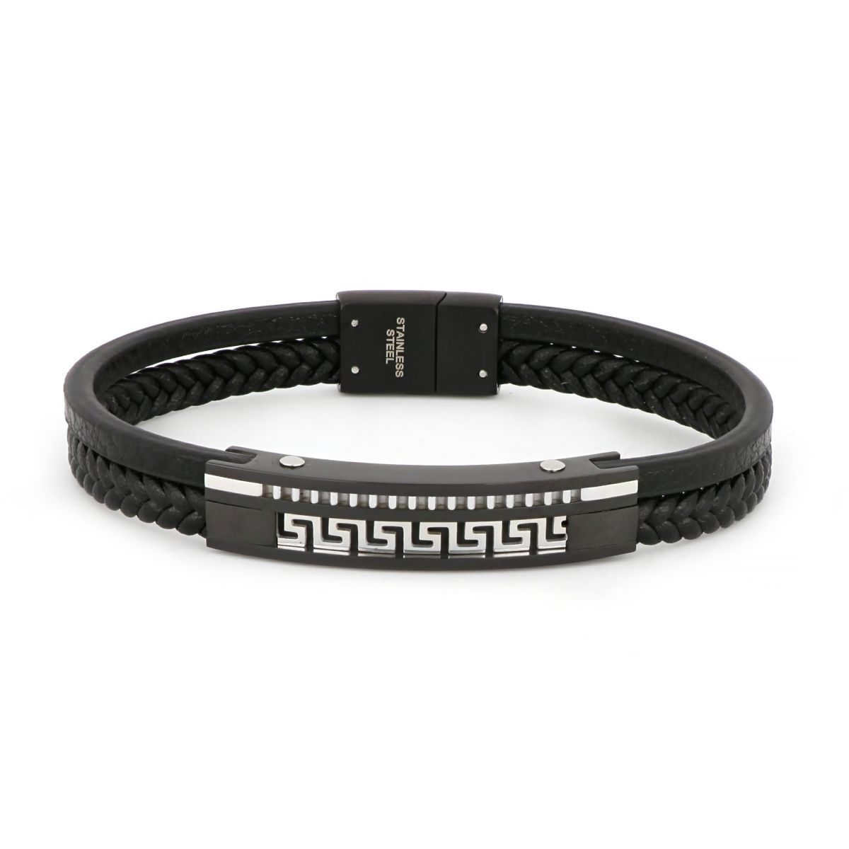 Bracelet made of one knitted and one flat black leather in black color with meander design made of stainless steel (BR22042-04)