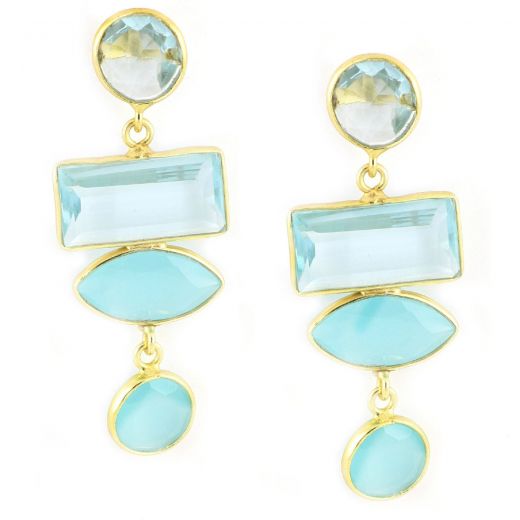925 Sterling Silver earrings gold plated. The stones of love and creativity in an elegant jewellery! Two stones blue topaz and two stones aqua chalcedony. Size of the stones 8mm, 17x10mm, 15x7mm και 8mm.